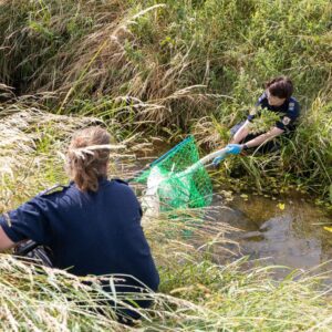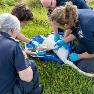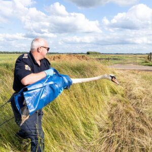 Een nat, pak, einden lopen en doorzetten – want de zwaan liet zich niet zomaar vangen – leidden ertoe dat we de knapperd konden vangen. Bij beoordeling konden we geen breuken vinden, maar blijkt het vermoedelijk een oude fractuur. De zwaan is naar de vooropvang gebracht om vervolgens door de dierenarts te laten beoordelen. Vooreerst is de zwaan dus veilig.