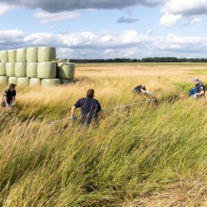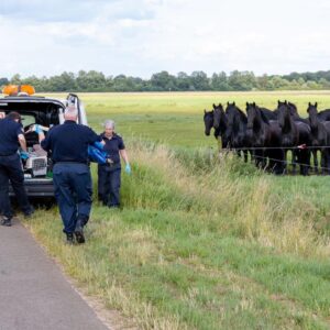 Gisteravond hebben we met een aantal collega’s deze prachtige zwaan moeten vangen. Dit weekend was er al een melding gedaan van de zwaan, waarvan de vleugel zou afhangen. Ook hadden we dit weekend al een vangpoging gedaan die niet was gelukt. Vandaar dat we voor vandaag even een zwaarder bemande actie hadden ingepland. Aangezien het vermoedelijk om een oude fractuur ging – de zwaan liep zo te zien al even met de vleugel rond, aangezien de veren waren afgesleten – hebben we deze actie in alle rust voorbereid. De actie werd goedkeurend bekeken door een prachtige kudde paarden.